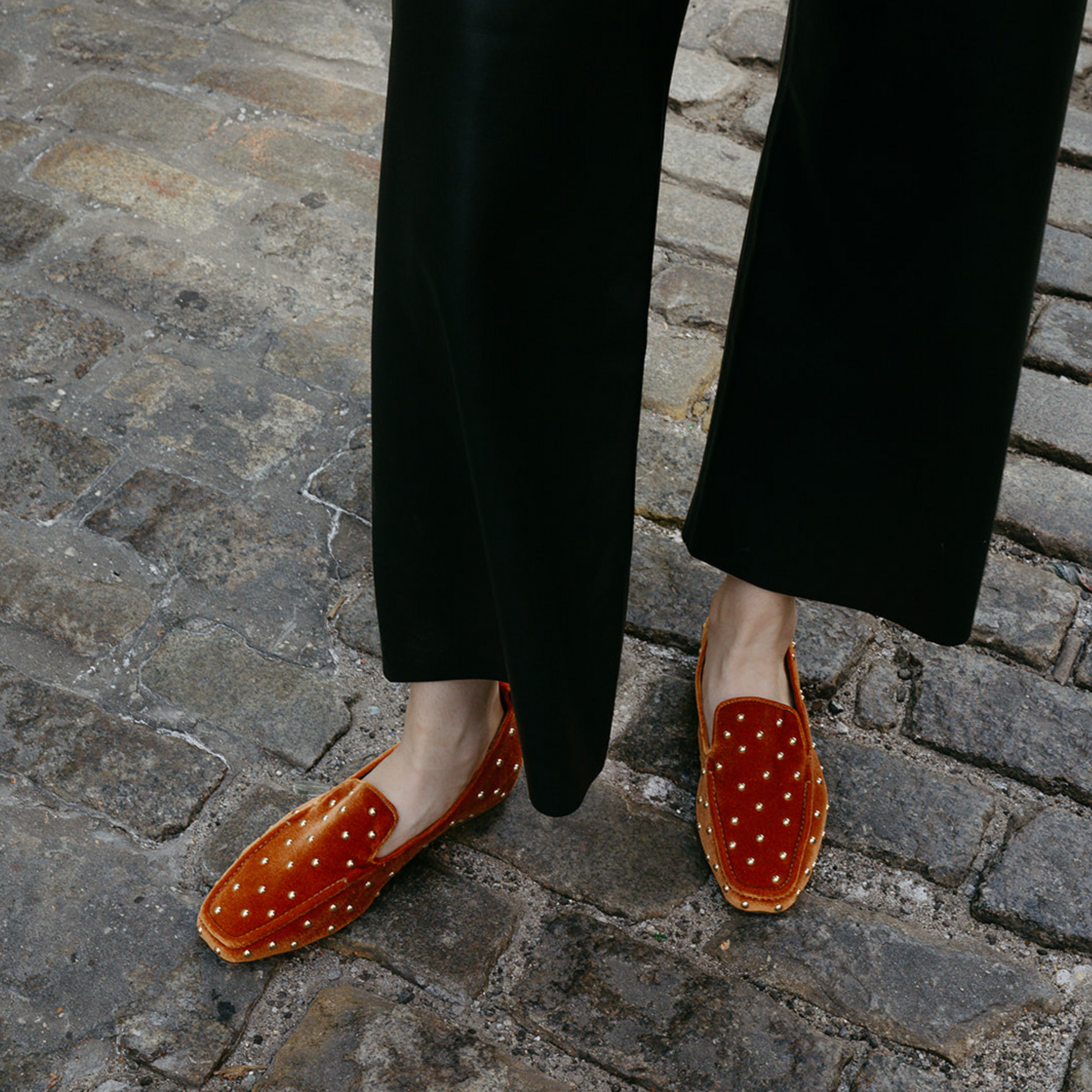 The Finley Mustard Velvet Stud Loafers add a fun touch to your wardrobe with rich mustard velvet, stud embellishments, and all-day comfort.