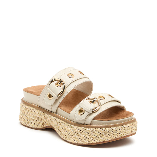 Warm auburn. Easy height. Polished detail. Penny pairs two smooth straps with eyelets and ring buckles for a clean statement slide. The street flex footbed cushions every step while a knit raffia wrapped heel adds texture and lift. Wear with airy sets, denim, or a simple slip and head out.